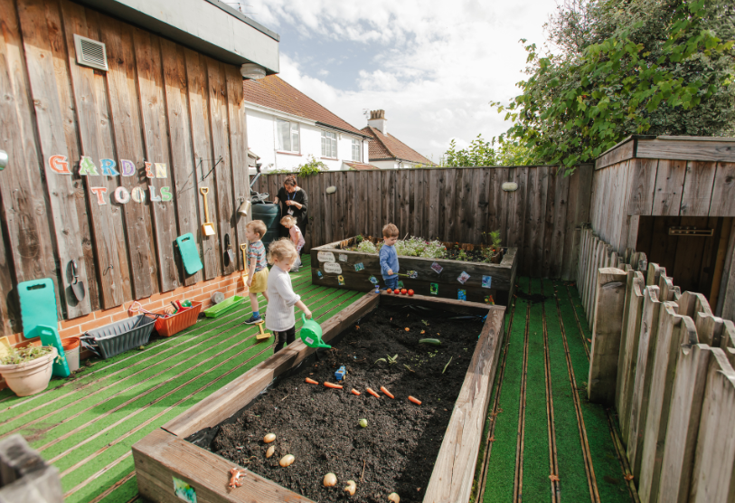 Our garden area for babies, purpose-built climbing frame for toddlers and allotment all encourage children to connect with nature.