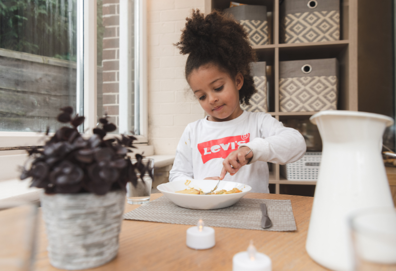 Children eat healthy meals together in smaller groups with opportunities to assist with serving.